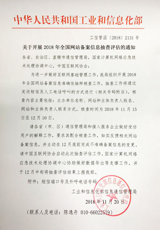 為進(jìn)一步做好互聯(lián)網(wǎng)基礎(chǔ)管理工作,工業(yè)和信息化部通信管理局組織開展2018年全國備案信息準(zhǔn)確性抽樣核查工作,抽查工作將通過發(fā)送短信及人工電話呼叫的方式進(jìn)行。核查工作發(fā)送短信端口號(hào)碼為:電信:106598051001、移動(dòng):106575000130、聯(lián)通:10655113,核查使用電話號(hào)碼為:0755118322、02296599818。核查內(nèi)容主要包括:主辦單位名稱、網(wǎng)站和主體負(fù)責(zé)人姓名、網(wǎng)站和主體負(fù)責(zé)人聯(lián)系方式,核查時(shí)間為2018年11月15日至12月10日。